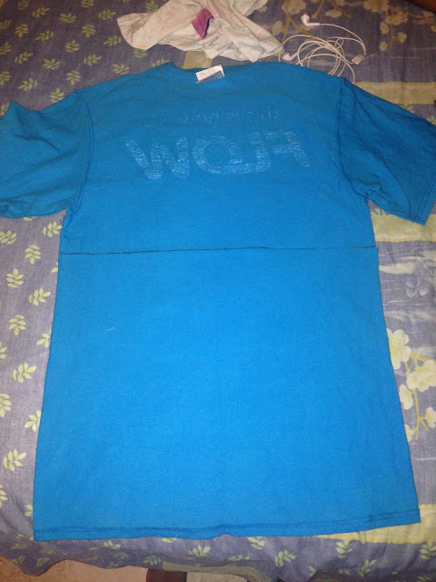 At this step I’m truly sorry about the blur picture I thought it was focused and I didn’t get a chance to retake it but I want you guys to see exactly whats going on. At this point I cut the shirt in half or little more than a half and also cut the sleeves and turn the shirt upside down because your actually going to use the hem-stitched part to put the elastic through. If you choose not to use that part you can always use a sewing machine to hem the part that you cut or even if your good at sewing you can hem that part for yourself.I used the already hem-stitched part its easier.