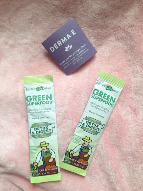 I got these two detox samples packets in the box its not from Derma E but I tried them and if your a picky person like me dont drink it with 8 oz water mix it with juice or in your shakes/smoothie. Its really powdery and bitter literally taste like green tea. It helps with bloating and weigh lost also has over 24 cleansing ingredients.